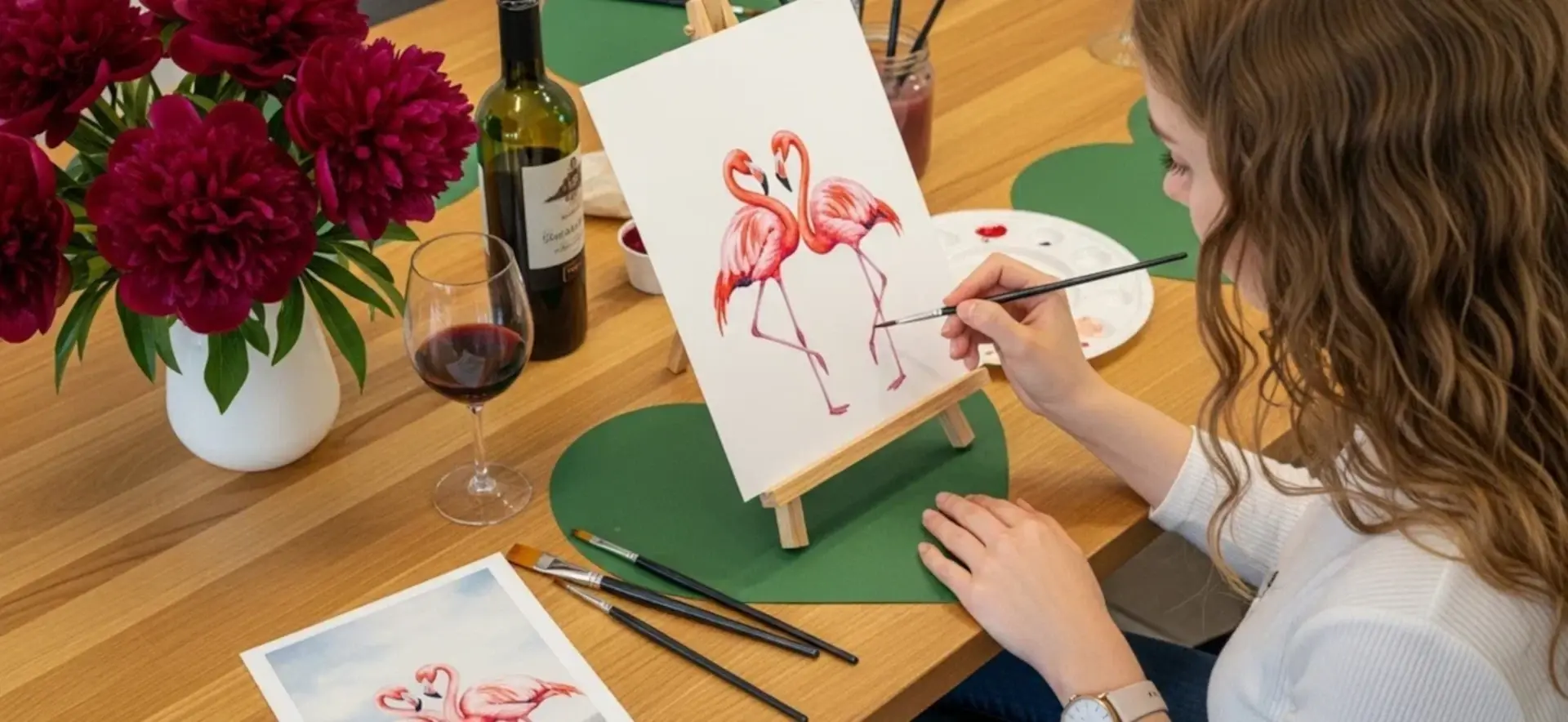 Естественно, всем участникам предоставляются необходимые материалы: кисти, палитры, емкости с вином для рисования, карандаши для наброска, а также фартуки и перчатки для защиты одежды. Вам не нужно беспокоиться ни о чем – все будет готово для Вашего события.