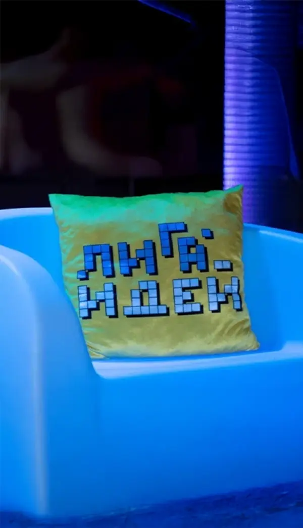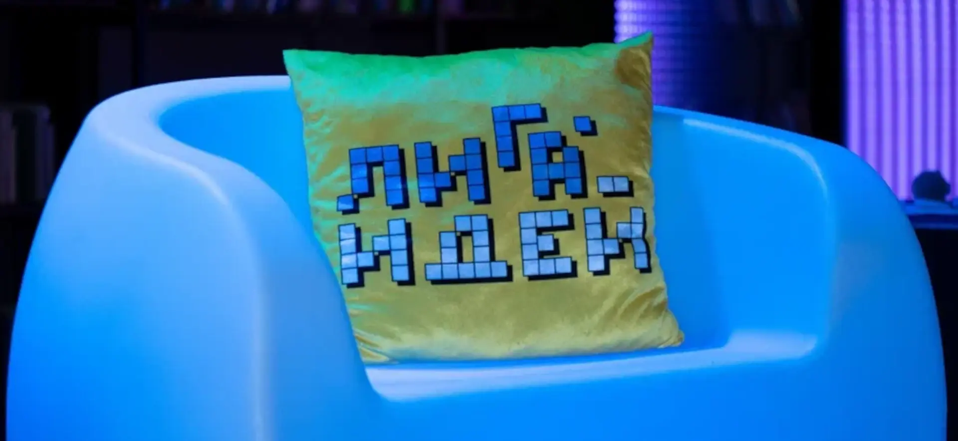- Добавили светящуюся мебель для диалогов между ведущим и спикерами, которая не закрывала экран и поддерживала общую эстетику.