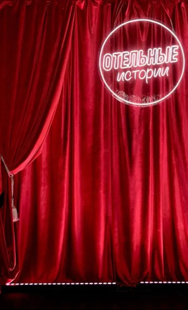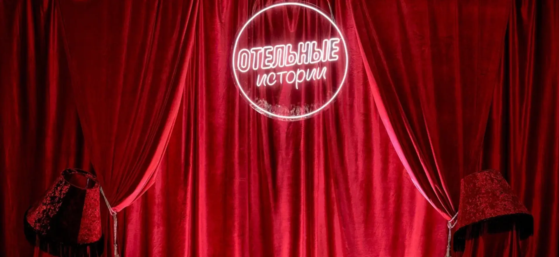 Мы создали сцену с LED-экранами и динамичными футажами в фирменном стиле вечера, а также эффектную фотозону в красных тонах с неоновой вывеской «Отельные истории».