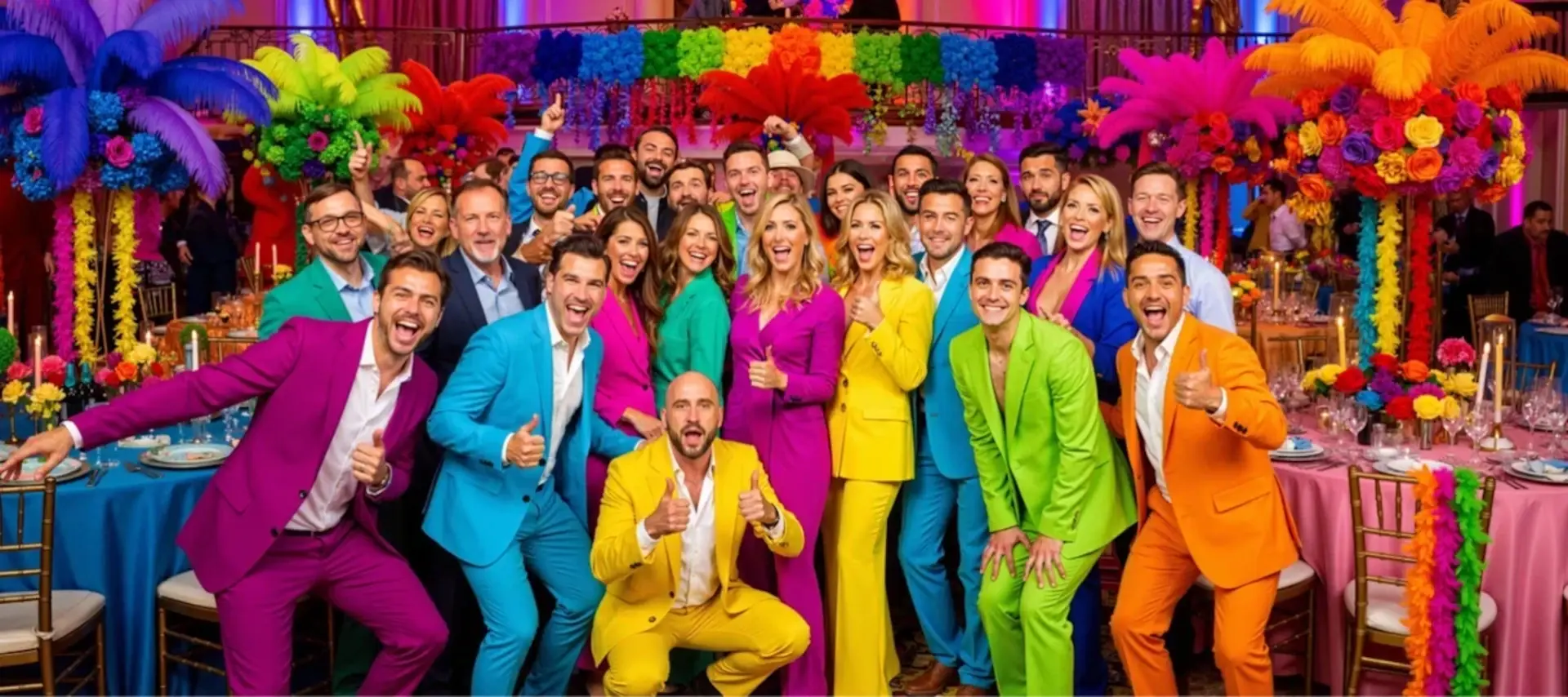 - Корпоратив. Цветная вечеринка для взрослых может опираться как на фирменные оттенки бренда, так и на смелый микс ярких цветов – вплоть до всей палитры радуги.