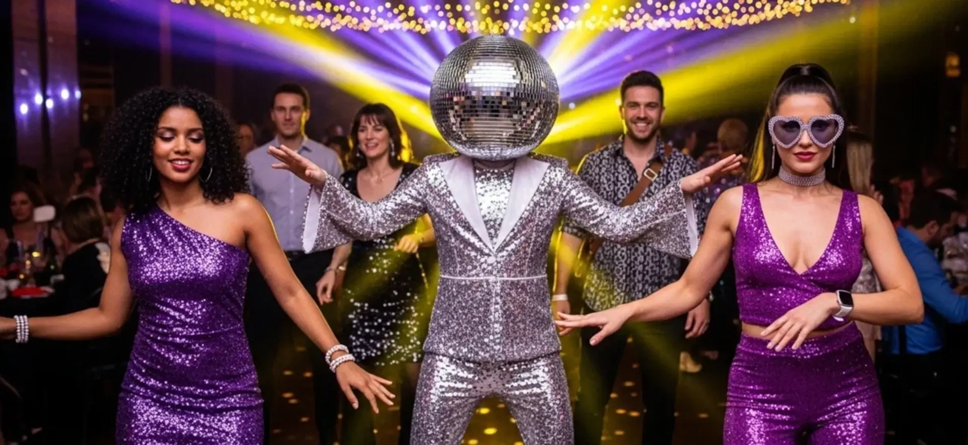 - Диско-сцена – зеркальные шары, световые лучи и аксессуары для танцевальных кадров.
